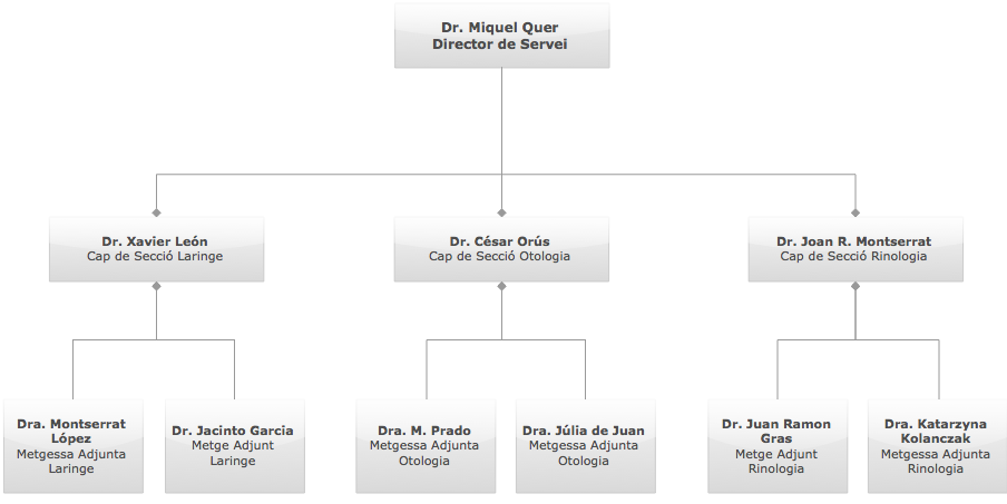 El Servei d’Otorinolaringologia té una estructura dividida en tres àrees de coneixement (seccions d’otologia, de rinologia i de laringologia-cap-coll) per facilitar el coneixement i la capacitat de solució davant les patologies del seu àmbit.