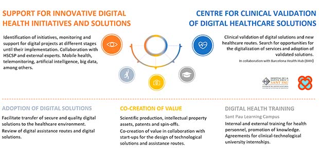 Services can be offered internally for Hospital solutions promoted by professionals of the Hospital, and externally for publicly owned companies or institutions that purchase the services offered by the UDH through their hiring. In this sense, it has been created the Center for Clinical Validations of Digital Solutions thanks to the agreement between the Hospital of Sant Pau and the Barcelona Health Hub, and the support of the Private Foundation of the Hospital of the Holy Cross and Sant Pau.