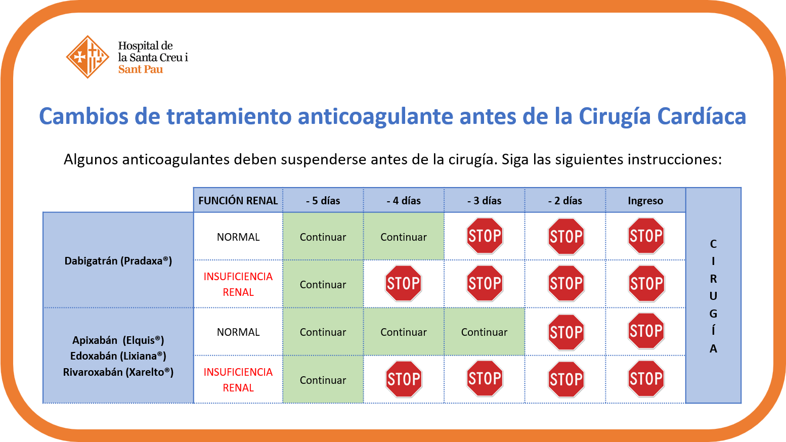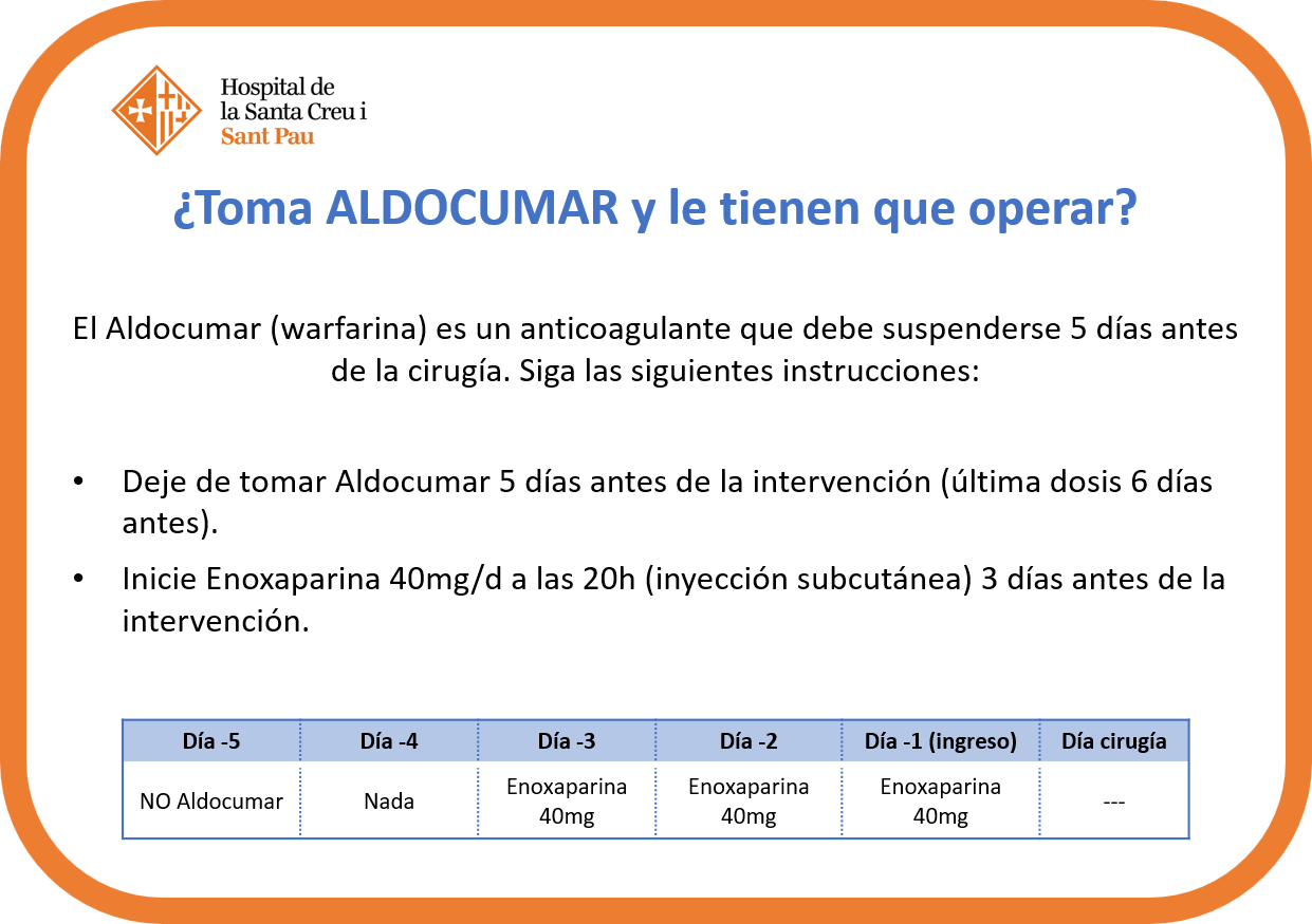 Si usted está tomando uno de estos medicamentos, comuníquelo en la visita preoperatoria y/o a la secretaria de cirugía cardíaca cuando le llame para programar la cirugía. En el caso del Sintrom y Aldocumar deberá realizar el cambio a heparina unos días antes de la intervención (ver fichas de tratamiento antitrombótico).
