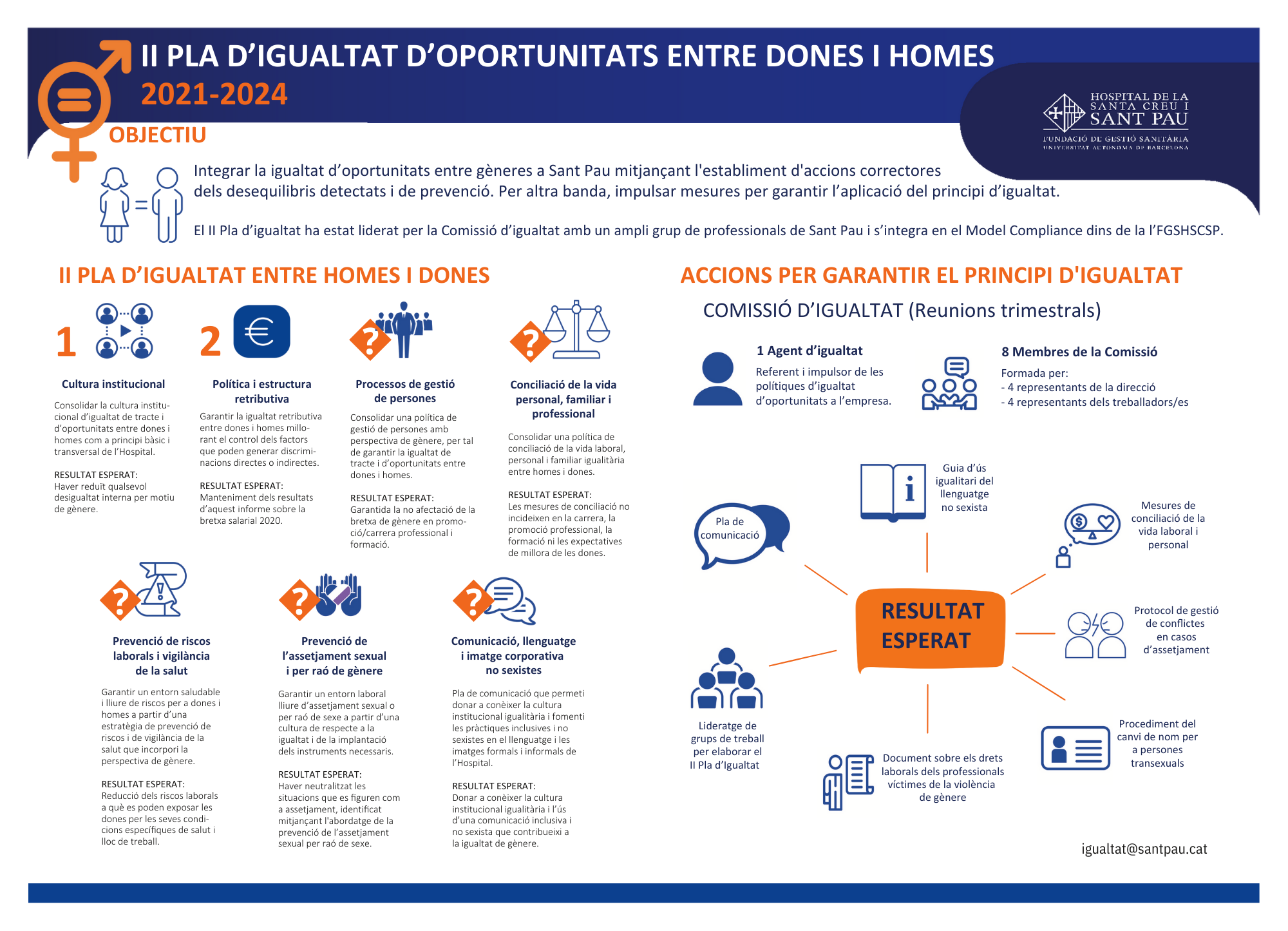 Amb la implantació i desenvolupament del Pla d'Igualtat de Sant Pau es continuarà treballant pel respecte a tots aquests principis, acceptant, a més, la responsabilitat de millora de la situació present i facilitant, a la vegada, la participació de tots/es els/les professionals i la de llurs representants legals.