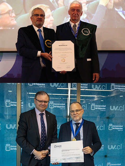 La Universitat UTE de Quito (Equador) i la Universitat de Valparaíso (Xile) han investit els Drs. Xavier Bonfill i Gerard Urrútia, respectivament, com a doctors honoris causa de les seves respectives institucions en reconeixement de la col·laboració docent i científica iniciada ja fa molts anys enrere en el marc de la Col·laboració Cochrane. -