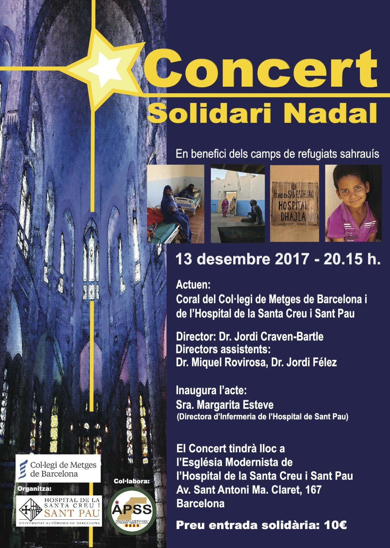 El proper 13 de desembre, a les 20.15 hores, la Coral del Col·legi de Metges de Barcelona i de l’Hospital de la Santa Creu i Sant Pau oferiran un concert solidari a l’Església Modernista de l’Hospital. Els diners recaptats aniran en benefici dels camps de refugiats sahrauís.