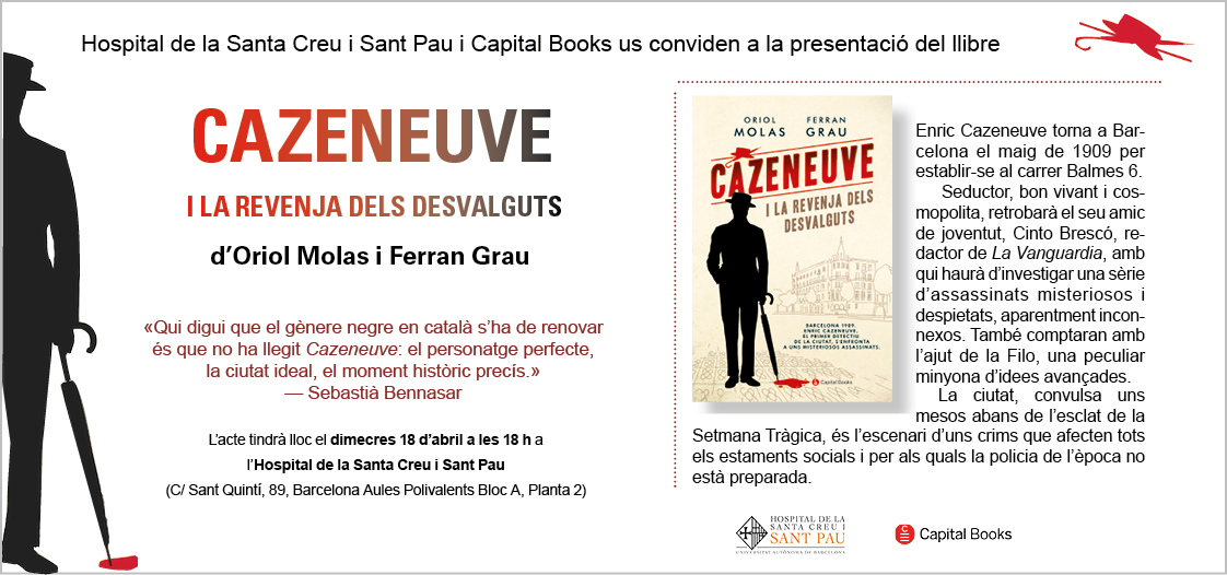 El pròxim 18 d'abril a les 18h a les aules polivalents tindrà lloc la presentació del llibre “Cazeneuve i la revenja dels desvalguts”, d’Oriol Molas i Ferran Grau. Una novel·la que recupera el personatge històric que va obrir una agència de detectius a la Barcelona de començaments del segle XX i que té l’Hospital de Sant Pau com algun dels escenaris on transcorre l’acció.