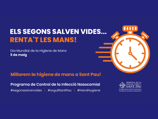Des de 2009 l’OMS ens convida a unir-nos a la celebració del Dia Mundial de la Higiene de Mans, que se celebra cada 5 de maig. Des de Sant Pau, enguany amb el lema: “Els segons salven vides... Renta’t les mans” destaquem la importància de la higiene de mans en el punt d’atenció (espai que reuneix tres elements: el pacient, el professional sanitari i l’atenció o tractament que implica contacte amb el pacient i el seu entorn).