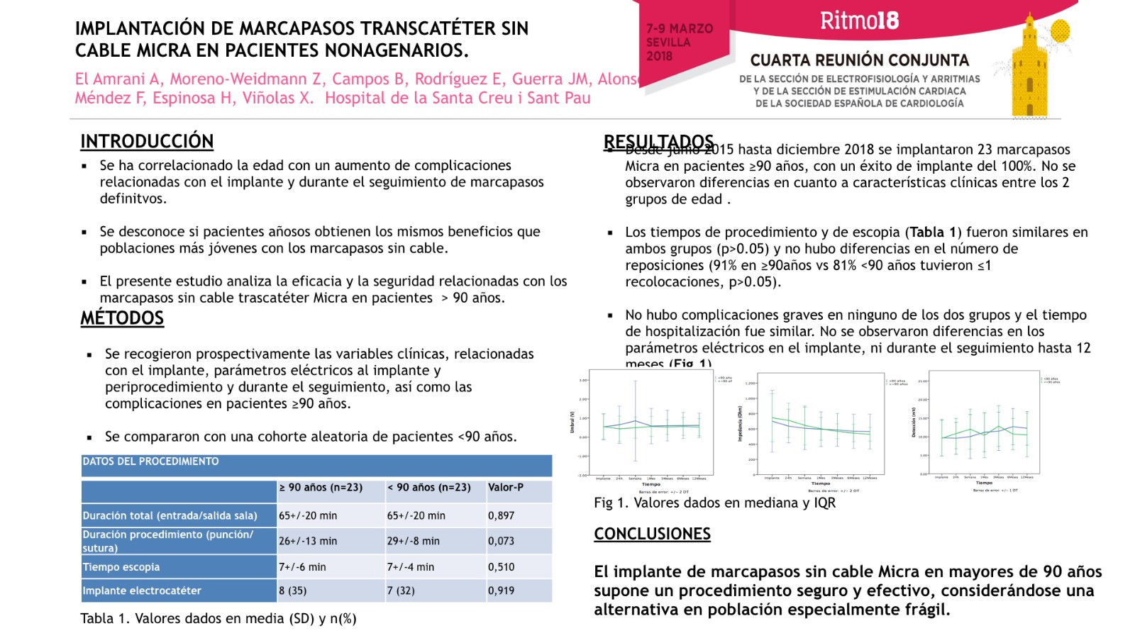 L’equip liderat pel Dr. Xavier Viñolas, cap de la Unitat d’Arrítmies del Servei de Cardiologia de Sant Pau, ha guanyat el “Premio Estudio Original de Estimulación Cardiaca” que concedeix Ritmo18 durant la quarta reunió conjunta de la Sección de electrofisiología y arrítmias y de la Sección de estimulación cardiaca de la Sociedad Española de Cardiología pel seu treball “Implantación de marcapasos transcatéter sin cable micra en pacientes nonagenarios”.
