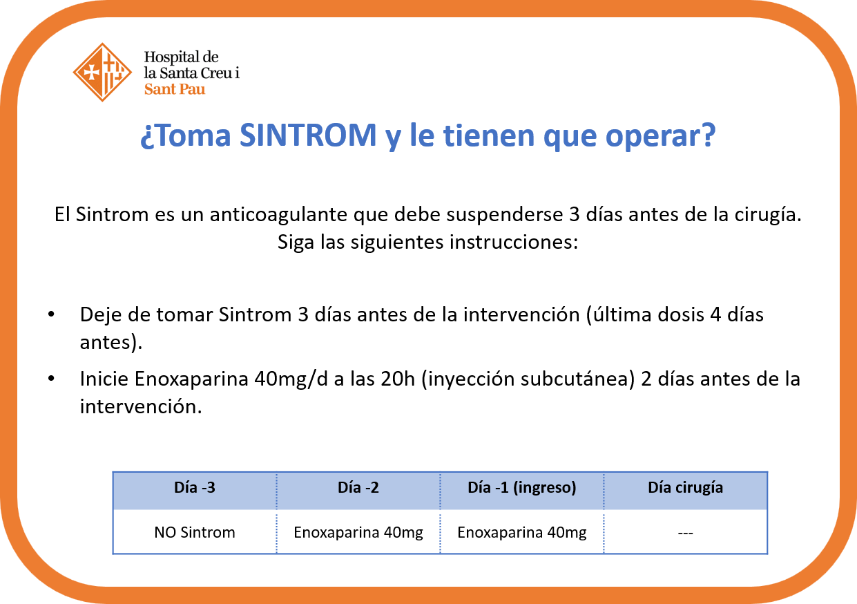 Si usted está tomando uno de estos medicamentos, comuníquelo en la visita preoperatoria y/o a la secretaria de cirugía cardíaca cuando le llame para programar la cirugía. En el caso del Sintrom y Aldocumar deberá realizar el cambio a heparina unos días antes de la intervención (ver fichas de tratamiento antitrombótico).