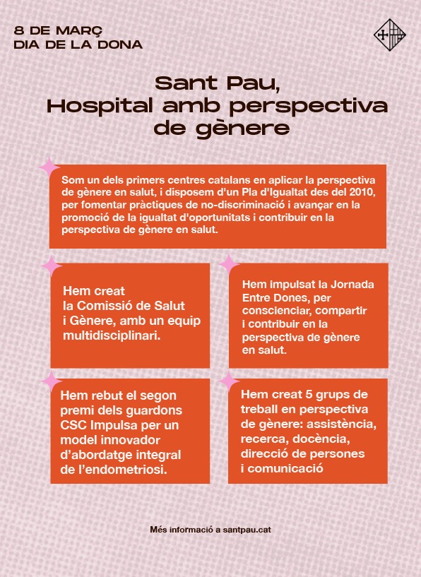Sant Pau és un dels primers centres catalans en aplicar la perspectiva de gènere a la salut. El març de 2022 va crear una Comissió de Salut i Gènere, amb la idea d’impactar en l’assistència, la recerca i la docència, i que reforça la seva posició com a centre punter en aquest àmbit responent a les necessitats dels pacients i la societat.