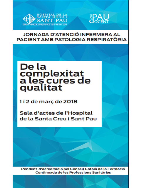 Els propers 1 i 2 de març, la Direcció Infermera de l’Hospital de la Santa Creu i Sant Pau organitza la jornada “De la complexitat a les cures de qualitat”, a la sala d’actes de l’Hospital. Una cita adreçada als professionals de la Salut per a que desenvolupin i apliquen les seves competències, amb coneixements i habilitats en el procés de cura del pacient afectat de patologia respiratòria.