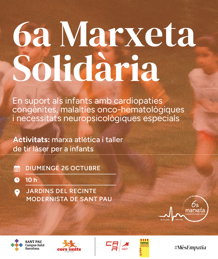 El pròxim diumenge 26 d’octubre a les 10 h, l’Hospital de Sant Pau i la Fundació Cors Units organitzen la VI Marxeta amb més cor que mai als Jardins del Recinte Modernista de Sant Pau, una iniciativa en suport als infants amb cardiopaties congènites, malalties onco-hematològiques i necessitats neuropsicològiques especials.