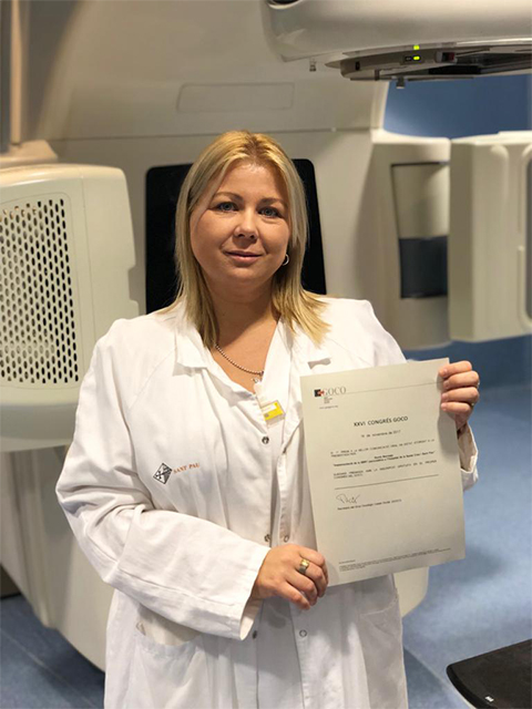 Sonia Bermejo, infermera gestora de casos de Radioteràpia va rebre recentment el Primer premi del Congrés del Grup Oncològic català-occità (GOCO 2018) per la seva comunicació "Implementació de la SBRT pancreàtica a l'Hospital de la Santa Creu i Sant Pau"
