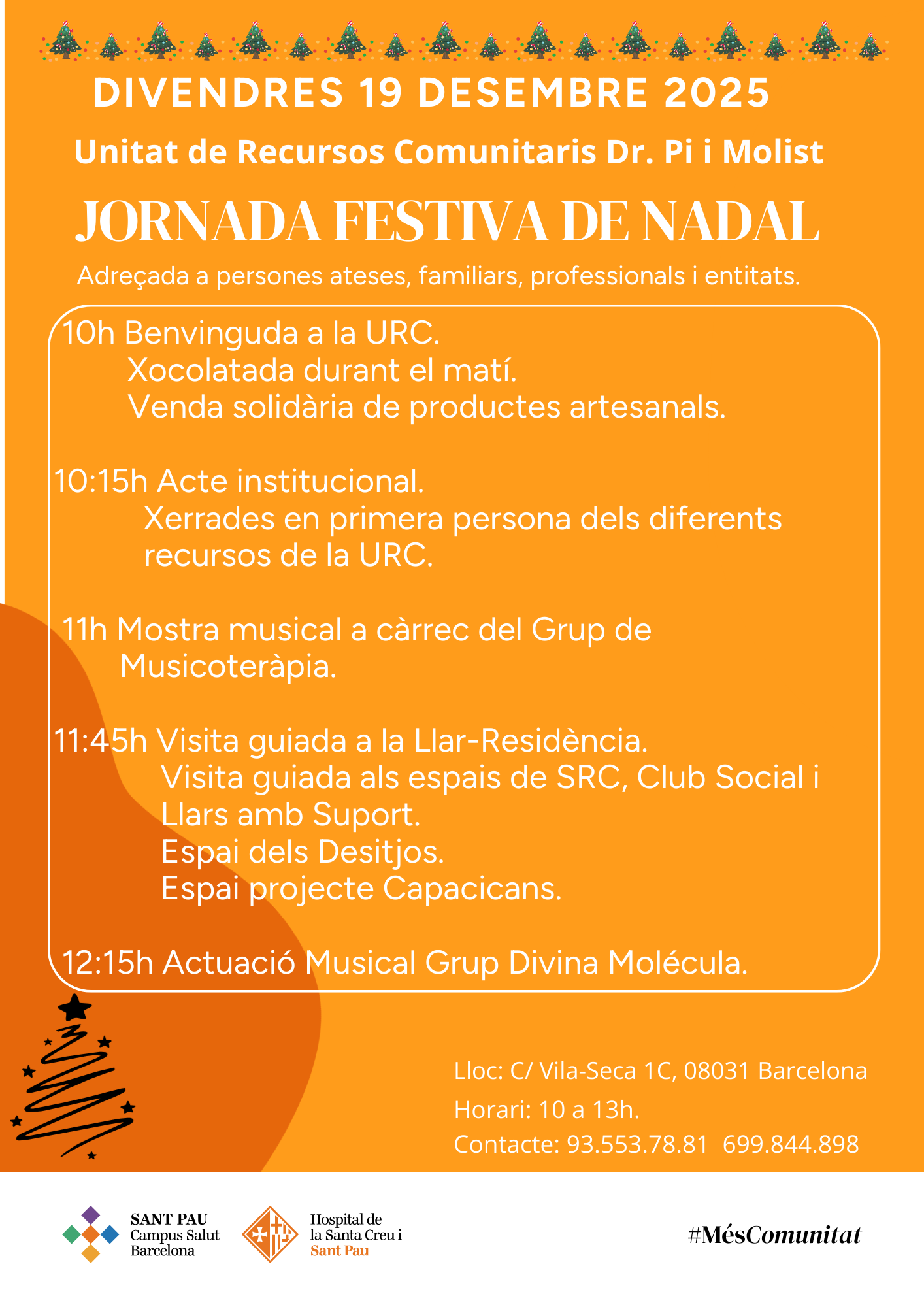 Amb motiu de les festes nadalenques, la Unitat de Recursos Comunitaris Dr. Pi i Molist, del Servei de Psiquiatria de Sant Pau, organitza el pròxim divendres 19 de desembre una Jornada festiva adreçada a persones ateses, famílies, professionals i entitats... Durant tot el matí es podran visitar els espais, conèixer el funcionament de la Unitat i participar en activitats i xerrades de sensibilització envers la salut mental. Tanmateix, esperem que aquesta celebració sigui una oportunitat per trobar-nos i compartir propostes i experiències.